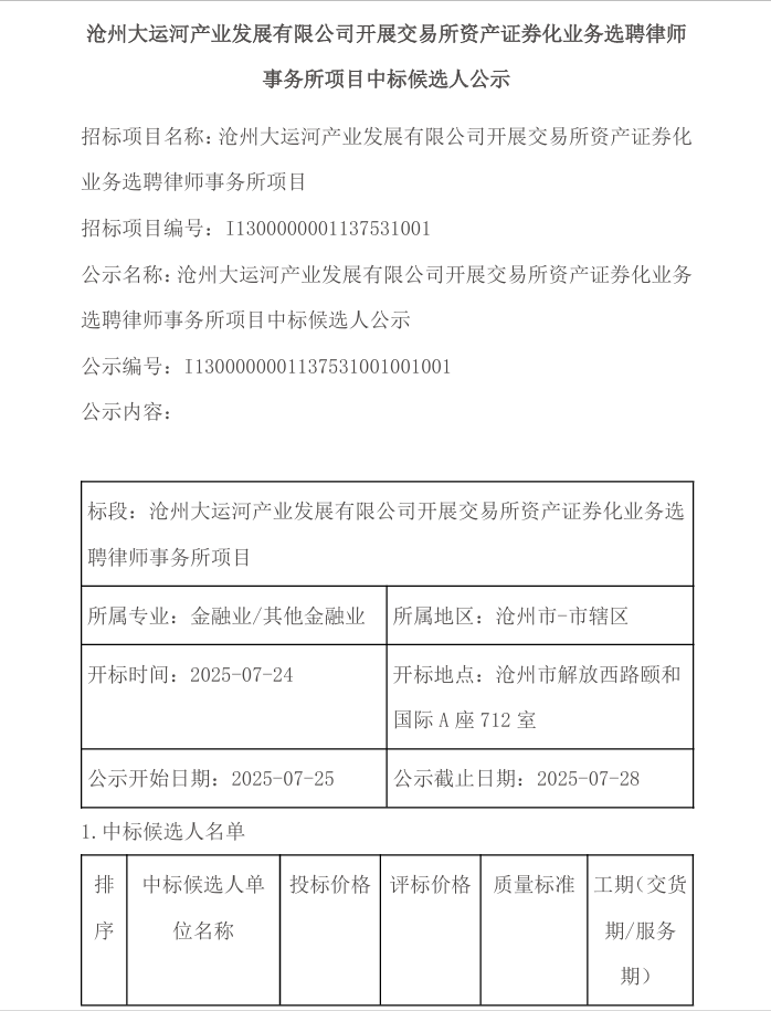 滄州大運(yùn)河產(chǎn)業(yè)發(fā)展有限公司開展交易所資產(chǎn)證券化業(yè)務(wù)選聘律師事務(wù)所項目中標(biāo)候選人公示