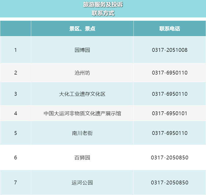 為了更好地服務大家,保障大家在滄州大運河的游玩體驗,現公布以下相關地點的旅游服務及投訴聯(lián)系方式,在這里您可以反饋各類問題和意見,若您在游玩過程中遇到任何不盡如人意之處,請及時聯(lián)系我們。