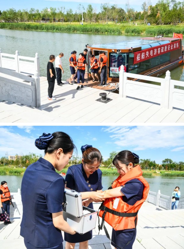 模擬游船在運行中出現(xiàn)電力故障無法運行的情況。青年志愿者、講解員、電力保障工作人員各司其職,迅速開展游客安撫、船只調度、游客轉移、電力檢修等應急措施。