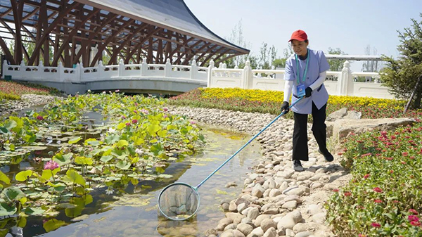 她負責(zé)的是園博園1號門內(nèi)的廣場地面衛(wèi)生以及廣場附近水域內(nèi)的衛(wèi)生,用她的話說,那是園博園的臉面。所以這就要求她無論在什么天氣、什么時間,都要對自己負責(zé)區(qū)域內(nèi)的衛(wèi)生有更嚴(yán)格的要求。