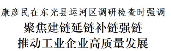 4月17日,市委書記康彥民到東光縣、運河區(qū)調(diào)研檢查。他強調(diào),要深入貫徹習近平新時代中國特色社會主義思想,完整準確全面貫徹新發(fā)展理念,堅持工業(yè)強市、產(chǎn)業(yè)興市,真抓實干、挖掘潛力,創(chuàng)新驅(qū)動、激發(fā)活力,大力建鏈延鏈補鏈強鏈,推動工業(yè)企業(yè)做大做強,為滄州高質(zhì)量發(fā)展提供重要支撐和堅實保障。