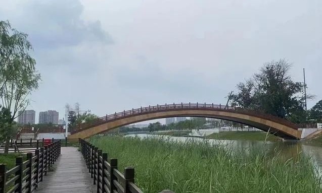連接百獅園與南川樓的步行橋 連接運(yùn)河公園與佟家花園的步行橋。 連接運(yùn)河公園與清池南大道的步行橋。 位于運(yùn)河公園東南方向的步行橋也具備了通行條件。這座橋在原來(lái)臨時(shí)浮橋的位置修建,連接運(yùn)河公園和清池南大道。這座橋設(shè)計(jì)新穎,充滿現(xiàn)代感,采用了新型材料。拱橋外側(cè)采用鋁合金仿木裝飾漸變形式,橋面為弧線型,并設(shè)置踏步。兩側(cè)欄桿不同于其他幾座橋,采用的是合金材料欄桿加木制扶手,在現(xiàn)代感中增加了一些傳統(tǒng)元素。這座步行橋?qū)?.5米,凈跨徑為單跨50米。這座橋建成后,便于運(yùn)河?xùn)|岸的居民到運(yùn)河公園游玩。
