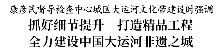 2月14日,市委書記康彥民就中心城區(qū)大運河文化帶建設(shè)進行督導檢查。康彥民強調(diào),黨的二十大報告提出“加大文物和文化遺產(chǎn)保護力度”,要深入學習貫徹黨的二十大精神和習近平總書記重要指示批示精神,全面落實黨中央決策部署和省委、省政府工作要求,以大運河文化帶重點項目建設(shè)為引領(lǐng),抓好細節(jié)提升,打造精品工程,全力建設(shè)中國大運河非遺之城。