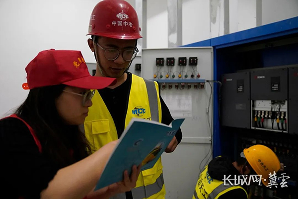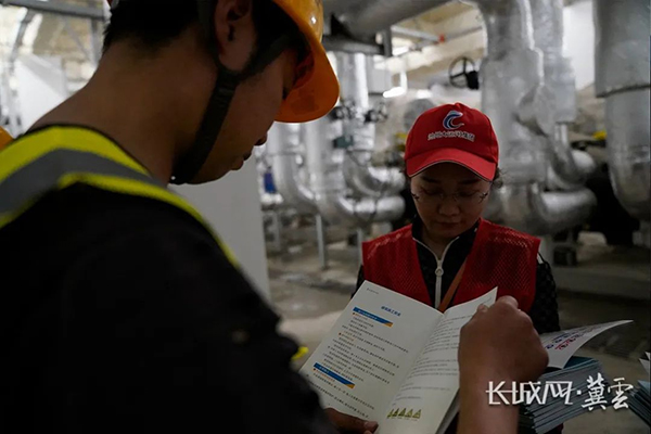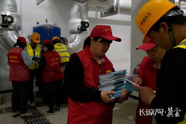 大運(yùn)河集團(tuán)志愿者向一線工人講解安全生產(chǎn)手冊(cè)。長(zhǎng)城網(wǎng)·冀云客戶端記者 崔上 攝