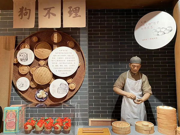 “大家現(xiàn)在看到的是天津的特色小吃:煎餅果子、狗不理包子、天津糖葫蘆、十八街麻花和耳朵眼炸糕……”來到天津段展區(qū),講解人員正在介紹古街上的各種店鋪,除美食外,還有傳統(tǒng)手工藝?yán)厦廊A手工鞋和以達(dá)仁堂為代表的傳統(tǒng)醫(yī)藥,更有獨(dú)創(chuàng)的茶壺機(jī)器人說相聲。中心展示著天津泥人張作品《津門碼頭》,用35個(gè)泥塑人物和與之對(duì)應(yīng)的場(chǎng)景,再現(xiàn)天津三岔河口百業(yè)興旺的繁榮場(chǎng)面。