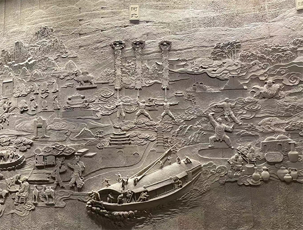 走進(jìn)一樓的中國(guó)大運(yùn)河非物質(zhì)文化遺產(chǎn)總覽廳,一塊巨大浮雕映入眼簾,展示了大運(yùn)河流域沿線8省(市)的航運(yùn)風(fēng)貌、代表性建筑景觀和非遺項(xiàng)目,盡顯大運(yùn)河非遺的精彩與壯闊。