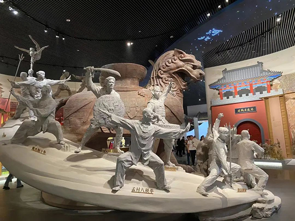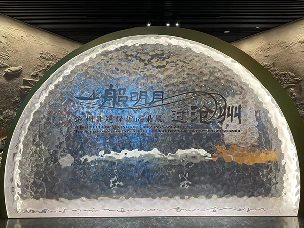 來到河北段展區(qū),首先映入眼簾的便是河北三寶之一、滄州的標(biāo)志性文物——滄州鐵獅子,周邊環(huán)繞著運(yùn)河形態(tài)的飄帶,上面以雕塑的形式展現(xiàn)了河北俠義豪杰、武風(fēng)烈烈的精神。