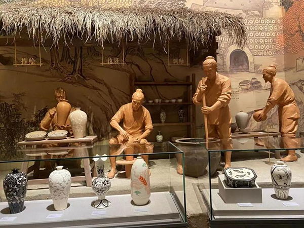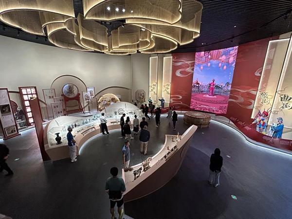 鐵獅子旁邊展出的是國(guó)家級(jí)非物質(zhì)文化遺產(chǎn)衡水內(nèi)畫,將祖國(guó)壯麗多姿的大好河山以及河北省運(yùn)河沿線城市的地標(biāo)建筑描繪在這晶瑩剔透的壇瓶之中,生動(dòng)地展示了內(nèi)畫“寸幅之地具千里之勢(shì)”的藝術(shù)表現(xiàn)力。此外,磁州窯、邢瓷、勝芳燈會(huì)等非遺項(xiàng)目也一一呈現(xiàn)在游客面前。繼續(xù)往前走,便來到了“齊魯鐘神秀”的山東段展區(qū)。在這里,不僅能在投影中看到隆重的祭孔大典和琳瑯滿目的孔府菜,還能現(xiàn)場(chǎng)體驗(yàn)泰山東岳廟會(huì),欣賞山東的傳統(tǒng)戲劇和曲藝,了解何為“十不閑”絕技的泰山皮影。進(jìn)入河南段展區(qū),抬頭看去,頭頂?shù)哪档せㄔ煨团c下面的牡丹花型展臺(tái)相呼應(yīng),突出了“洛陽(yáng)牡丹甲天下”的風(fēng)采。展臺(tái)上的唐三彩、鈞瓷、汝瓷、絞胎瓷等,各有特色,伴隨著大屏幕中的豫劇表演,別有一番韻味。