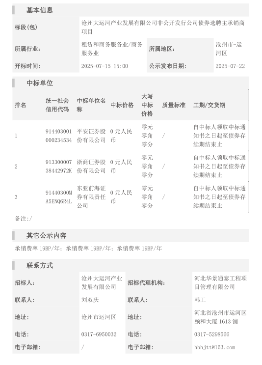 滄州大運河產(chǎn)業(yè)發(fā)展有限公司非公開發(fā)行公司債券選聘主承銷商項目中標公告