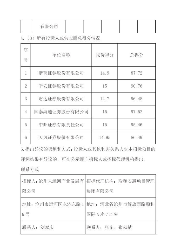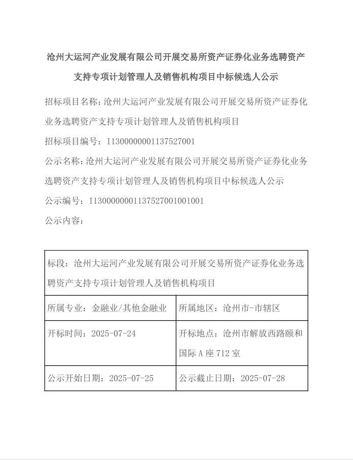 滄州大運(yùn)河產(chǎn)業(yè)發(fā)展有限公司開(kāi)展交易所資產(chǎn)證券化業(yè)務(wù)選聘資產(chǎn)支持專項(xiàng)計(jì)劃管理人及銷售機(jī)構(gòu)項(xiàng)目中標(biāo)候選人公示